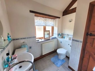 Walk-in shower, pedestal wash hand basin and a low level w.c. Partly tiled walls. Vaulted beamed ceiling. Storage cupboard. Radiator. Rear facing window. Ceramic tiled floor.