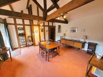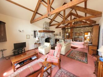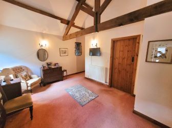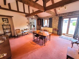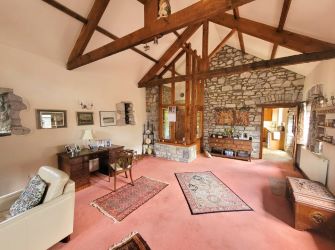A most impressive spacious room with a vaulted beamed ceiling and exposed stonework. Large stone built feature fireplace with inset electric fire. Windows to the side and rear elevations plus a door to the side. Three radiators. Fitted carpet. Power points. Feature stone archway to:
