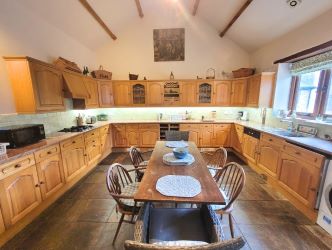 Large well fitted kitchen with a range of matching wall and base units with formica working surfaces. Inset stainless steel sink unit. Built-in electric oven and gas hob with extractor over. Integrated dishwasher. Plumbed for washing machine. Ample room for a table and chairs. Vaulted beamed ceiling. Partly tiled walls. Window and door overlooking the central courtyard. Slate flooring. Cupboard housing one of the central heating boilers. Various power points.