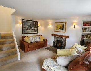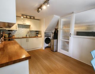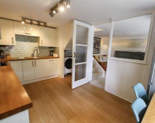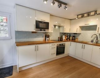 The kitchen is a fully fitted modern kitchen with wooden worktops and benefits from built-in Bosch induction hob, electric oven, integrated dishwasher & microwave, a stainless-steel sink/drainer, space and plumbing for a washing machine under the stairs, and space for a small kitchen table and a free-standing fridge freezer. There is a glass door leading into the cosy lounge, with a wood-burning stove on a slate hearth with stone surround and shelving on one side, and an open staircase up to the first floor.