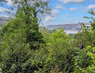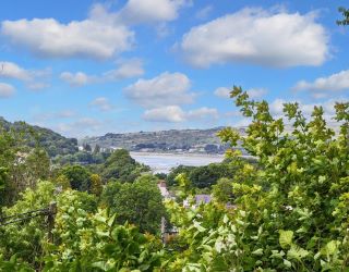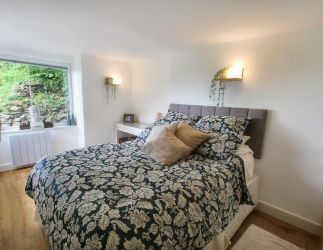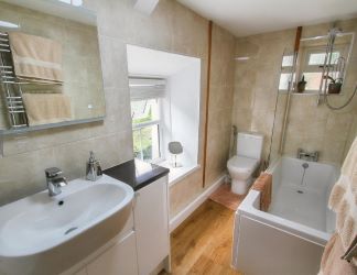 On the first floor is a small landing with an airing cupboard, and doors to two double bedrooms, with the master benefitting from a UPVC stable door opening out onto the top patio, offering stunning views over the garden, the valley and onto Gwbert and Poppit sands and the sea. The modern family bathroom has a vanity sink unit, a bath with an electric shower over and a toilet.