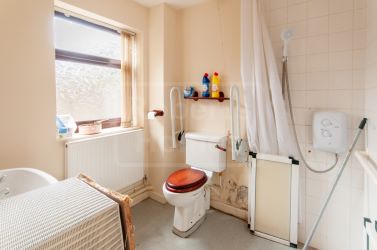 White W.C. and wash hand basin. Level entry corner shower. Non slip floor. uPVC double-glazed window to side. Radiator.