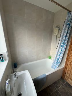 • Bathroom: Equipped with a cast iron bath complemented by an electric shower overhead, a wash hand basin, and a low-level W.C. The space is partially tiled, ensuring ease of maintenance.