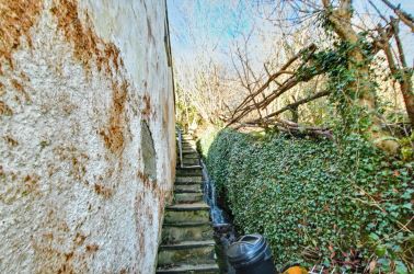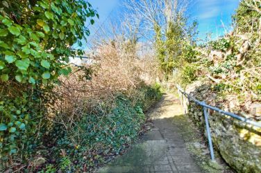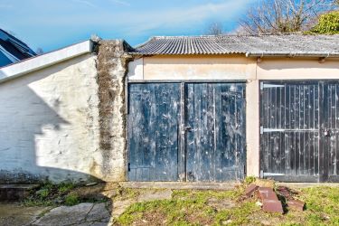 A footpath leads up to this charming end-of-terrace cottage, where the front garden sits beside the walkway. The property has plenty of character, with original windows, exposed stonework, and a feature fireplace adding to its appeal. A small garage sits at the front, offering useful storage space within an additional section built in behind it.