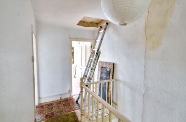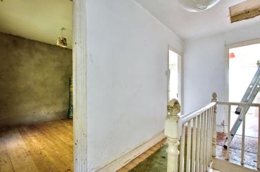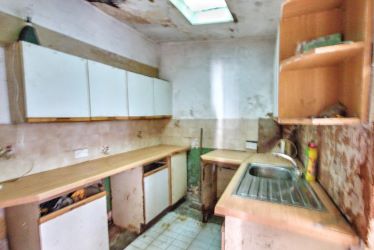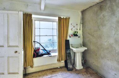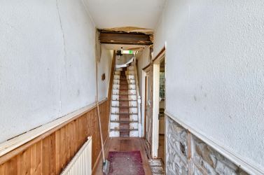 The entrance hall provides access to the main living area and the staircase to the first floor. The lounge and dining area is a generous space, featuring wooden flooring and an exposed stone fireplace as the focal point. Some structural work has already been done here, including the addition of a steel RSJ across the span of the room and tanking on the pine-end wall. To the rear, the kitchen extension provides a practical space, fitted with a sink, drainer, and a selection of wall and base units. A walk-in pantry and under-stairs cupboard add to the storage options, and there is direct access to the back of the property from here.