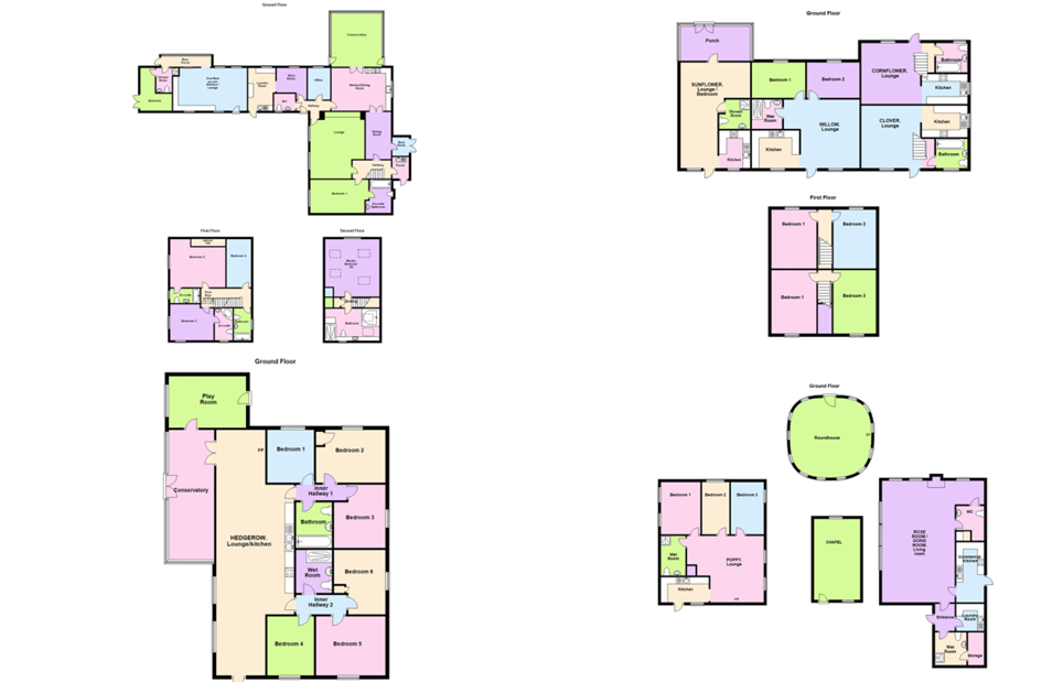 "Hedgerow" is a 6-bedroom detached bungalow that offers accessibility and comfort, with the interior divided into two wings, each featuring three bedrooms. The inclusion of a wheelchair-friendly wet room and an additional bathroom provides essential amenities for residents or guests. it has a spacious living space, with log burner in the lounge area an open plan kitchen and a dining area. A generous conservatory adds to the living space, an additional playroom provides a space for recreation and entertainment. The layout of "Hedgerow" lends itself to the possibility of being split into two separate living spaces, subject to the necessary consent. This property also boasts its self contained garden and decked area.