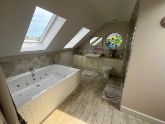 Ascending to the first floor, two double bedrooms, each with its own en suite for added privacy and convenience. An additional smaller bedroom adds versatility to the layout. A family bathroom completes this level. The third floor boasts a sense of luxury and spaciousness, with two rooms occupying the space. A generously sized bedroom with a vaulted ceiling and Velux windows offers countryside views. On the opposite side is a spacious bathroom, featuring a luxurious double spa bath, separate shower cubicle, WC, wash hand basin, and Velux windows. In summary, the farmhouse is a blend of functionality, and comfort.