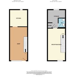 Ground floor retail unit with street-facing window frontage and rear kitchen area. First floor comprising two reception rooms, WC, and store room.