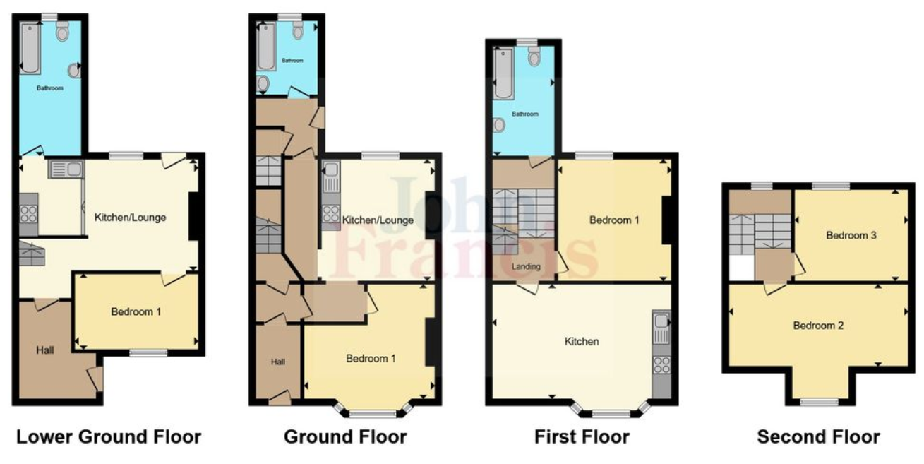 The property is arranged over four levels and fully independent services. The lower ground floor flat benefits from access to a private rear courtyard and features an open-plan living area with a contemporary fitted kitchen, a generous double bedroom and a stylish en-suite shower room. The ground floor flat retains the charm of the original bay windows, with a bright living room, separate modern kitchen, shower room and double bedroom. The top flat, arranged over the first and second floors, is a spacious duplex with an open-plan lounge and kitchen area, a large double bedroom, modern shower room and additional storage tucked into the eaves.
