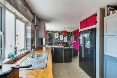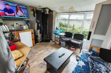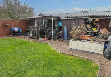The rear garden is mainly laid to lawn and includes a substantial timber outbuilding, currently used as overflow accommodation. This space incorporates a lounge area, kitchen facilities, shower room, and sleeping area, offering potential for a range of uses such as annexe, studio, or workspace (subject to any necessary consents).